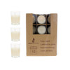 A box of 12 unscented candles in a glass holder. These container candles are elegant enough for the most sophisticated events yet simple enough for everyday use. They are clean burning with a wick made of 100% cotton. They have a burn time of up to 5 hours.